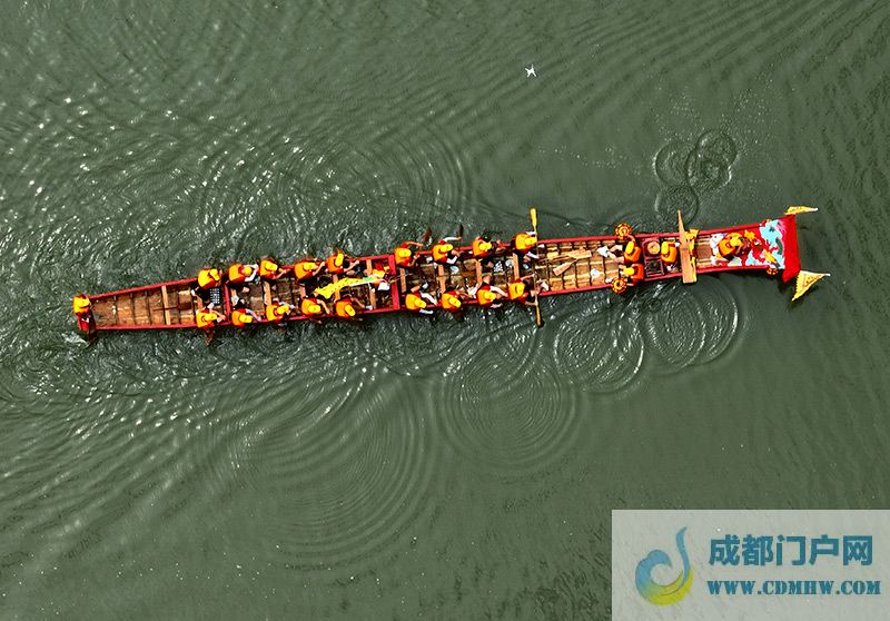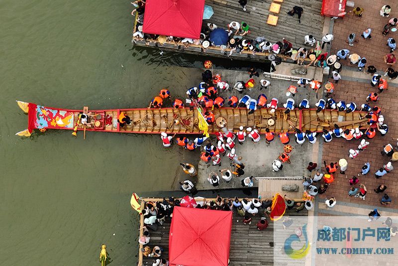 6月13日,在莆田木兰溪畔举行的端午节龙舟传统祭江仪式现场,一艘龙舟下水(无人机照片)。