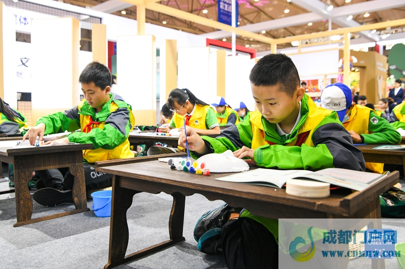 10月13日,在位于成都市世纪城新国际会展中心的2023天府书展主展场,参加研学活动的学生在体验脸谱绘制。新华社记者 唐文豪 摄
