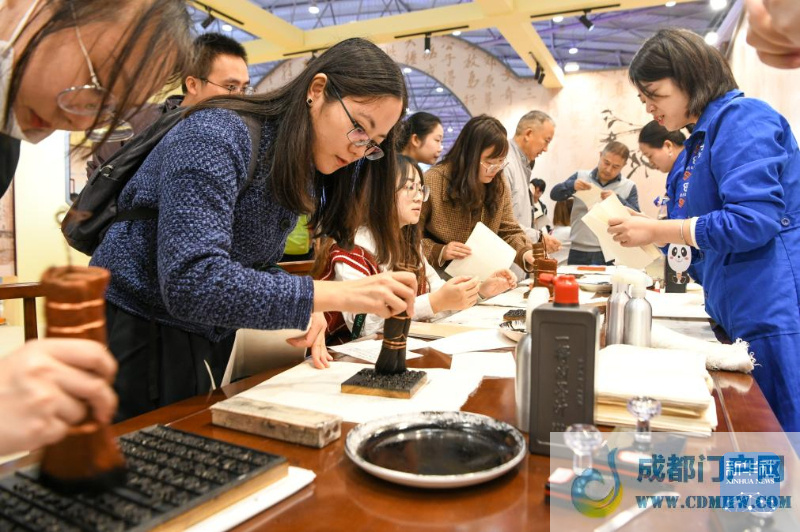10月13日,在位于成都市世纪城新国际会展中心的2023天府书展主展场,市民在体验印刷技艺。新华社记者 唐文豪 摄
