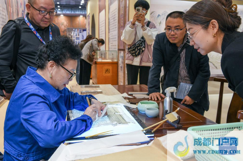 10月13日,在位于成都市世纪城新国际会展中心的2023天府书展主展场,市民在观看古籍修复师修复书页。新华社记者 唐文豪 摄