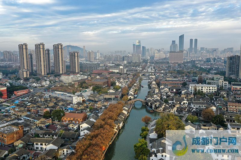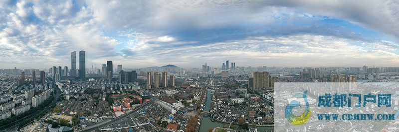 古运河畔的清名桥历史文化街区与市区晨景(无人机全景照片,12月9日摄)。