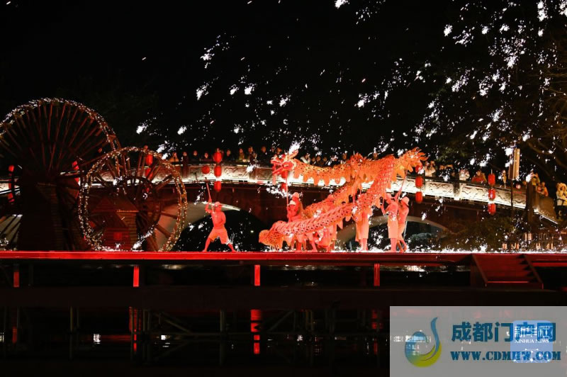 别样的传统非遗项目演出同样在春节期间大放异彩。在成都双流区黄龙溪镇,从初一至初八,这里每晚都会上演“烧火龙”表演。约1500摄氏度的铁汁被击打成10多米高的铁花,舞龙者赤膊上阵,一条金黄的“火龙”穿梭其中,当万千铁花尽情绽放的一刹那,来自五湖四海的人们抬头仰望流光溢彩的夜空,在璀璨的光芒中许下美好愿望,充满烟火气的别样年味儿随之蔓延。