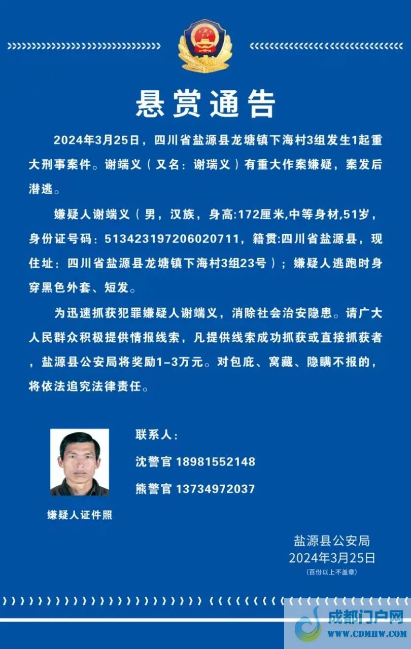 中新网3月26日电 据四川省凉山彝族自治州盐源县公安局消息,盐源县公安局3月25日发布悬赏通告:3月25日,四川省盐源县龙塘镇下海村3组发生1起重大刑事案件。谢端义(又名:谢瑞义)有重大作案嫌疑,案发后潜逃。嫌疑人谢端义(男,汉族,身高172厘米,中等身材,51岁)逃跑时身穿黑色外套。凡提供线索成功抓获或直接抓获者,盐源县公安局将奖励1-3万元。对包庇、窝藏、隐瞒不报的,将依法追究法律责任。