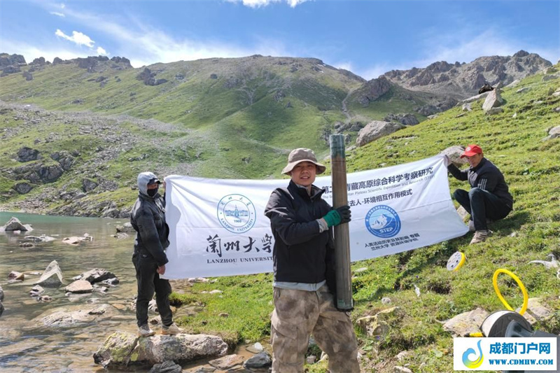 研究团队成员前往高山湖泊完成沉积物采样。(受访者供图)