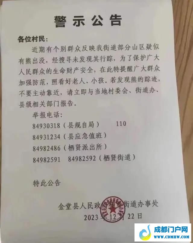 ▲2023年12月,金堂县栖贤街道贴出的疑似熊出没公告
