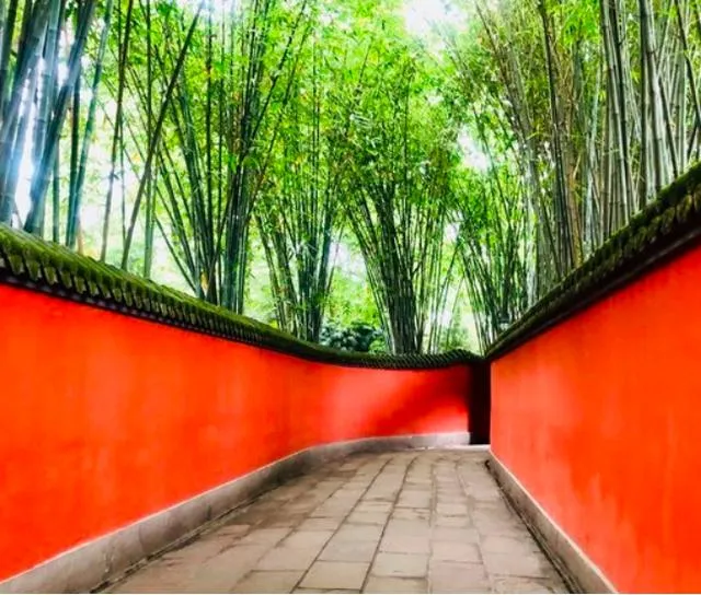 整条红墙夹道掩映在苍翠的竹林中,绿色的山水与红色的墙院形成对比,有种别样的美感。
