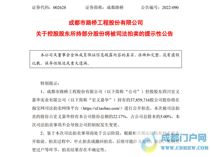 昨日晚间,成都路桥(002628)发布公告称,公司于2022年11月3日收到四川省成都市中级人民法院送达的《执行通知书》,成都中院将于2022年12月5日14:00时至2022年12月6日14:00时止(因竞价自动延时除外)在淘宝网司法拍卖网络平台公开拍卖公司控股股东宏义嘉华持有的3785.9716万股公司股份。