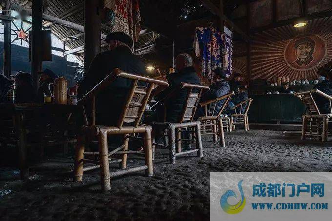 茶馆青瓦盖顶,木质穿斗的砖泥墙体。到处斑驳的墙壁,满墙的革命语录加上老式的桌椅,瞬间让你觉得时间依然停在那个火热的年代。