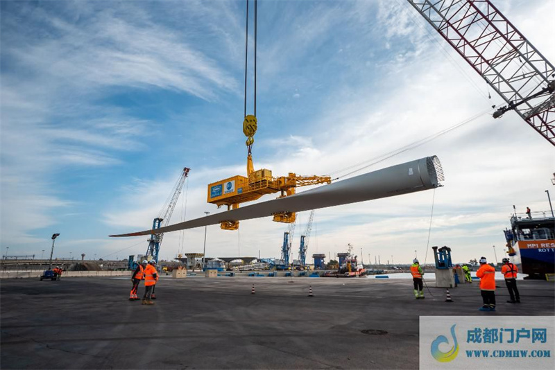 在意大利南部海港塔兰托,中国和意大利施工人员吊装风电叶片(1月27日摄)。新华社发(保拉·萨拉帕 摄)