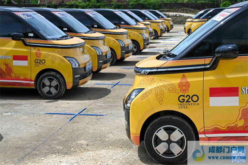 这是11月12日在印度尼西亚巴厘岛G20峰会主会场拍摄的五菱新能源车。