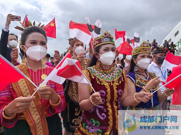 礼兵分列红地毯两侧致敬,身着民族服装的当地青年演奏起印尼传统乐器伽美兰,盛装印尼女青年跳起巴厘岛传统舞蹈“朋德舞”,当地学生挥舞中国和印尼两国国旗,用中文欢呼“欢迎,欢迎!”