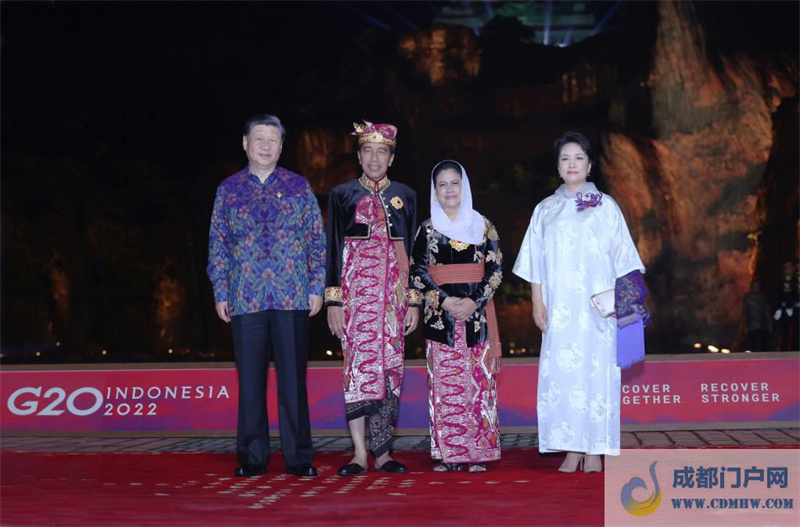当地时间11月15日晚,习近平和夫人彭丽媛出席佐科总统和夫人伊莉亚娜在巴厘岛神鹰广场举行的二十国集团领导人峰会欢迎晚宴。